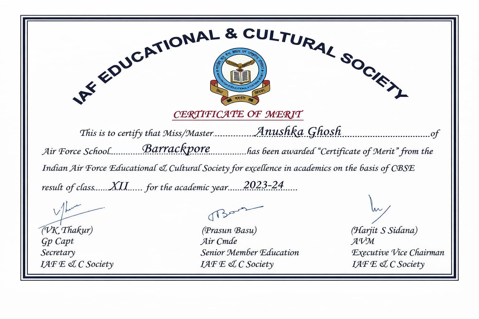 INDIAN AIR FORCE EDUCATIONAL AND CULTURAL SOCIETY, HAS AWARDED ANUSHKA GHOSH.